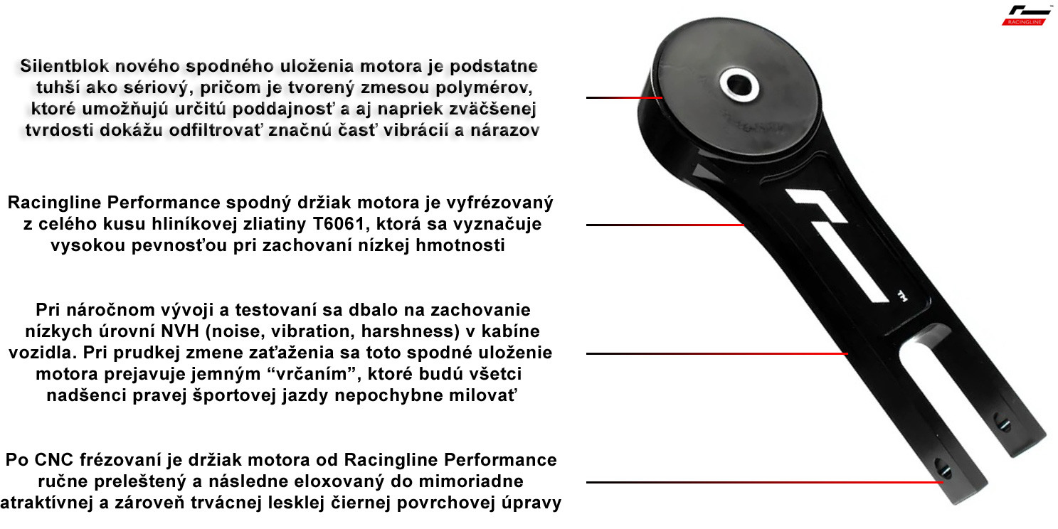 Vývojoví inžinieri Racingline Performance preto navrhli úplne prepracovaný spodný držiak motora a prevodovky vrátane jeho silentbloku, ktorý už nie je z mäkkej poddajnej gumy, ale zmesi polymérov s optimalizovanou tuhosťou, ktorá nijako zásadne nekazí bežný každodenný komfort jazdy (podarilo sa zachovať nízke hladiny NVH – noise, vibration and harshness), avšak je dostatočne tuhý, aby v spolupráci s novým hliníkovým držiakom takmer úplne potlačili odskakovanie kolies od vozovky pri prudkej akcelerácii z miesta a zásadne zlepšili kontakt kolies s vozovkou. Týmto podstatným upgrade sa zlepší prenos sily motora na kolesá (výsledkom je zvýšená trakcia prednej poháňanej nápravy), jazdné vlastnosti a ovládateľnosť vozidla v každej situácii.