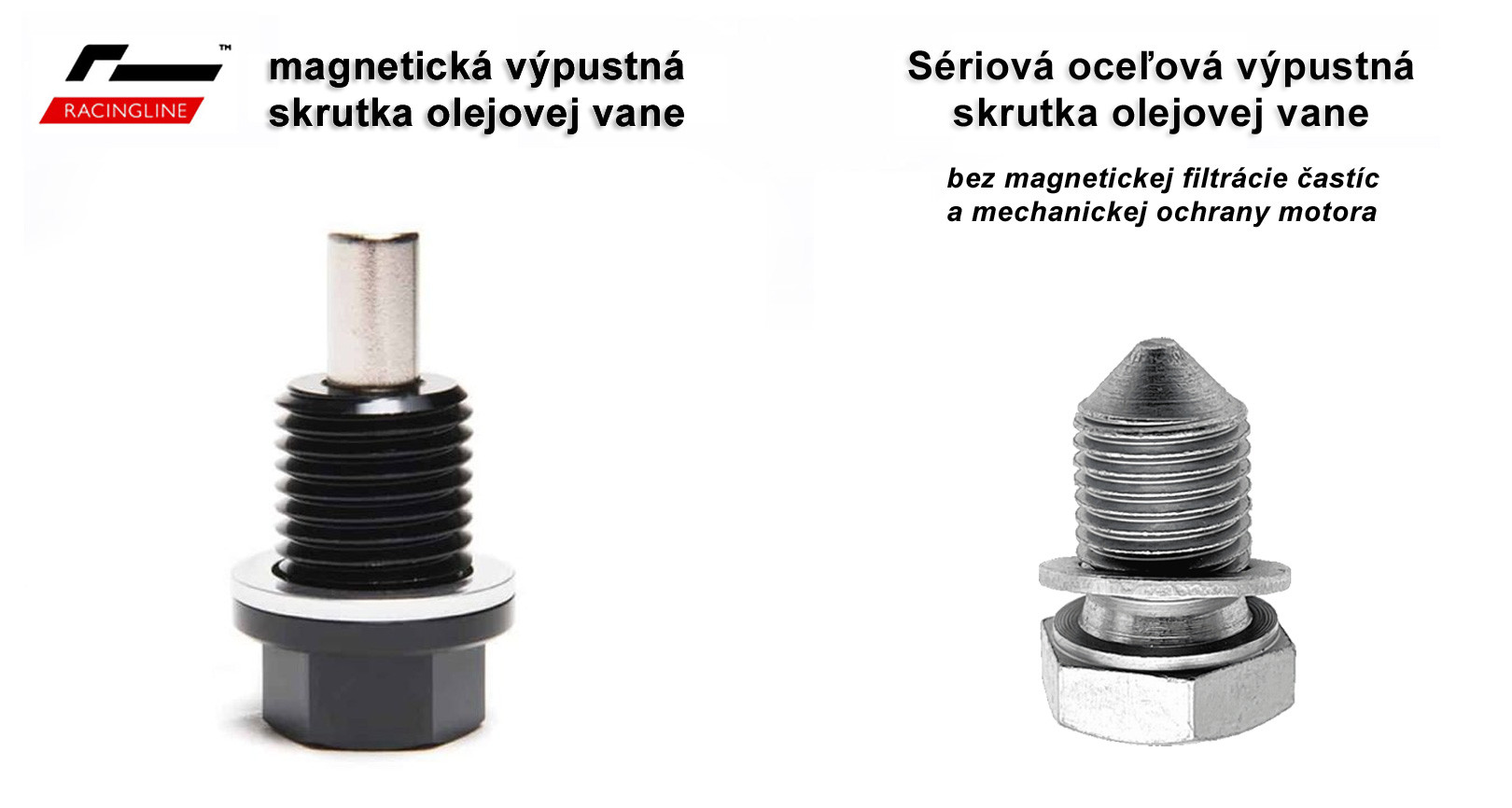 Racingline Performance výpustná skrutka motorového oleja má na svojom konci silný magnet s veľkou plochou, na ktorom sa kovové abrazívne mikročastice uvoľnené počas prevádzky motora zachytávajú a nedostávajú sa tak obehovým mazacím systémom naspäť do motora, čím sa zásadne zvyšuje jeho ochrana pred mechanickým poškodením a predčasným opotrebovaním.