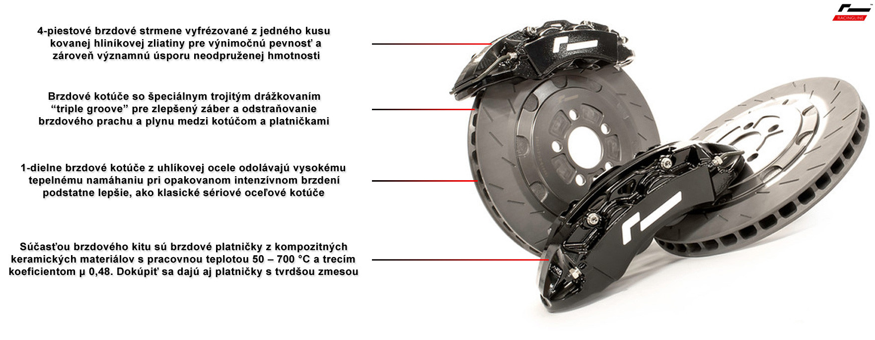 Jednodielne ventilované brzdové kotúče Racingline Performance majú rozmer 345x30 mm a unikátne trojité drážkovanie “Triple Groove”. Majú tiež väčšiu tepelnú kapacitu ako sériové nízkonákladové kotúče a teda aj menšiu tendenciu k vädnutiu pri opakovanom prudkom brzdení.
