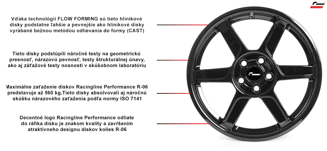 Tieto disky boli vyvíjané a sú vyrábané v EÚ, aby bola zaistená ich výnimočná pevnosť, bezpečnosť, spoľahlivosť, ako aj kvalita celého výrobného procesu, ktorý aj vďaka použitiu vysokokvalitných pevnostných materiálov a sofistikovaných výrobných postupov prekonáva štandardy kvality výroby OEM diskov. Disky Racingline Performance R-06 boli v priebehu ich vývoja podrobené náročným skúškam geometrickej presnosti, nárazovej odolnosti, testu štrukturálnej únavovej odolnosti materiálu a záťažovým skúškam. Maximálne zaťaženie disku R-06 predstavuje hodnotu 560 kg.
