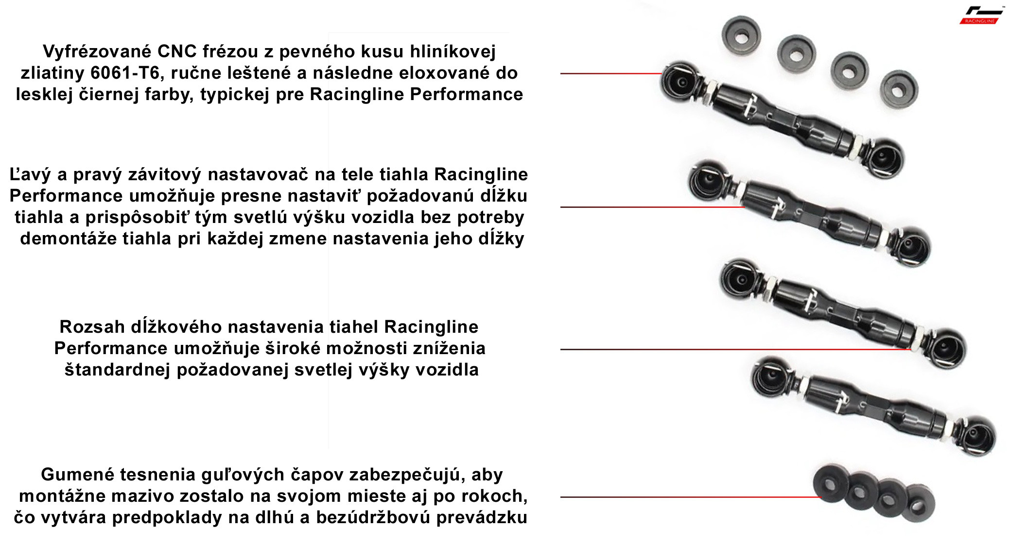 Nastaviteľné hliníkové tiahla Racingline Performance predstavujú priamu náhradu sériových tiahel pevnej dĺžky bez možnosti nastavovania. Vďaka širokému rozsahu dĺžkového nastavenia umožňujú maximálne zníženie vozidla až o 50 mm vpredu a vzadu, pričom sú navrhnuté tak, aby bezproblémovo fungovali s továrenskými senzormi výškovej regulácie, prostredníctvom ktorých vykonáva riadiaca jednotka systému vzduchového odpruženia úpravu svetlej výšky vozidla.