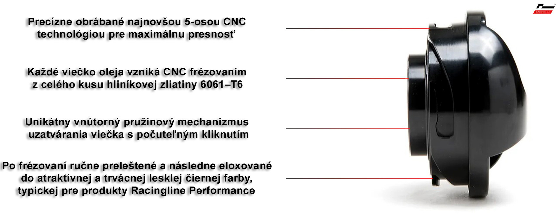 – už nikdy sa nebudete musieť obávať, či ste poriadne dotiahli olejové viečko, pretože hliníkové viečko oleja od Racingline Performance je vybavené unikátnym vnútorným pružinovým mechanizmom, ktorý po dosiahnutí požadovaného uťahovacieho momentu počuteľne “klikne“