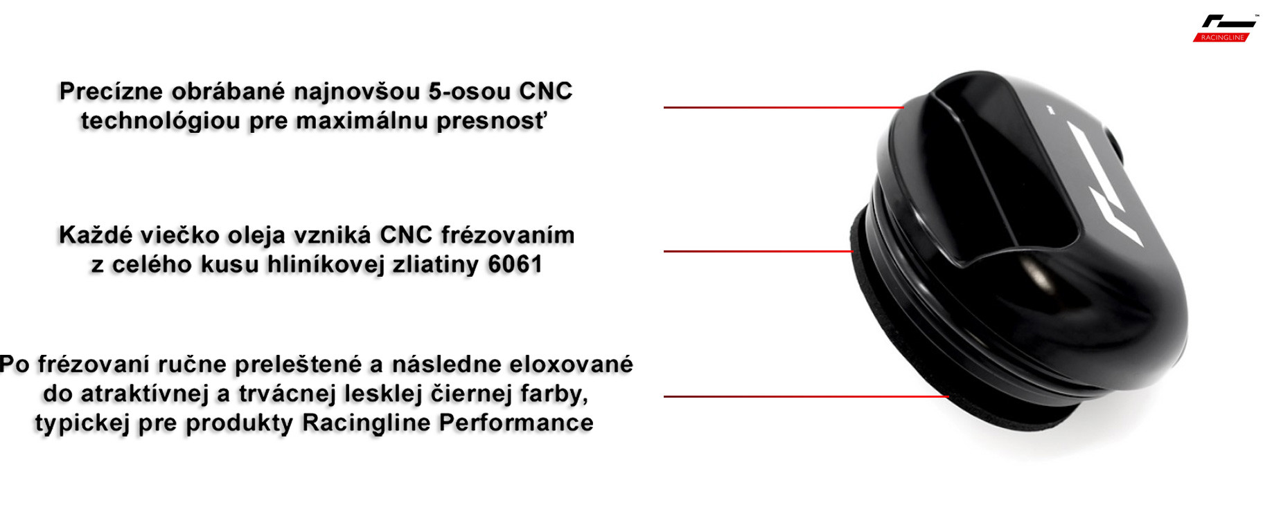 Každé hliníkové viečko oleja od Racingline Performance je vyrobené z pevného kusu hliníkovej zliatiny 6061 (konštrukčného duralu, ktorého výborné vlastnosti ho priam predurčujú na výrobky, u ktorých je kladený dôraz na ich pevnosť a odolnosť pri súčasnom zachovaní ich nízkej hmotnosti) pokročilou metódou 5-osého CNC frézovania. Výsledkom pokročilých metód obrábania hliníkovej zliatiny a jej následnej povrchovej úpravy eloxovaním je zaručený atraktívny vzhľad produktu, ktorý vydrží roky.