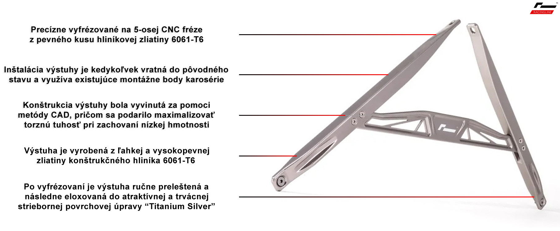 Racingline Performance predná rozpera karosérie je veľmi tuhá a pevná hliníková náhrada tenkej továrenskej výstuhy, ktorá výrazne spevňuje prednú časť karosérie a tým aj podvozku. Zosilnením a previazaním domcov horných uložení predných tlmičov pomáha udržiavať správnu geometriu zavesenia aj pri extrémnom dynamickom zaťažení v zákrutách a poskytuje konzistentnú odozvu riadenia, čím zabezpečuje oveľa prepojenejší a autentickejší zážitok zo športovej jazdy. Dramaticky zvýšená tuhosť prednej časti karosérie a zlepšené jazdné vlastnosti vozidla v zákrutách nie sú nijako vykúpené stratou komfortu jazdy, ani akýmkoľvek dodatočným hlukom, prípadne nežiadúcimi vibráciami. Úroveň NVH (noise, vibration and harshness) zostáva zachovaná na sériovej úrovni. Inštalácia Racingline Performance prednej výstuhy karosérie je jednoduchá a kedykoľvek vratná do pôvodného stavu. Pri inštalácii výstuhy nie je potrebné žiadne rezanie ani vŕtanie do karosérie, využívajú sa existujúce montážne body a otvory v karosérii Vášho vozidla.