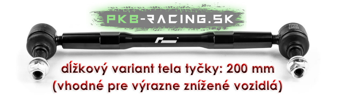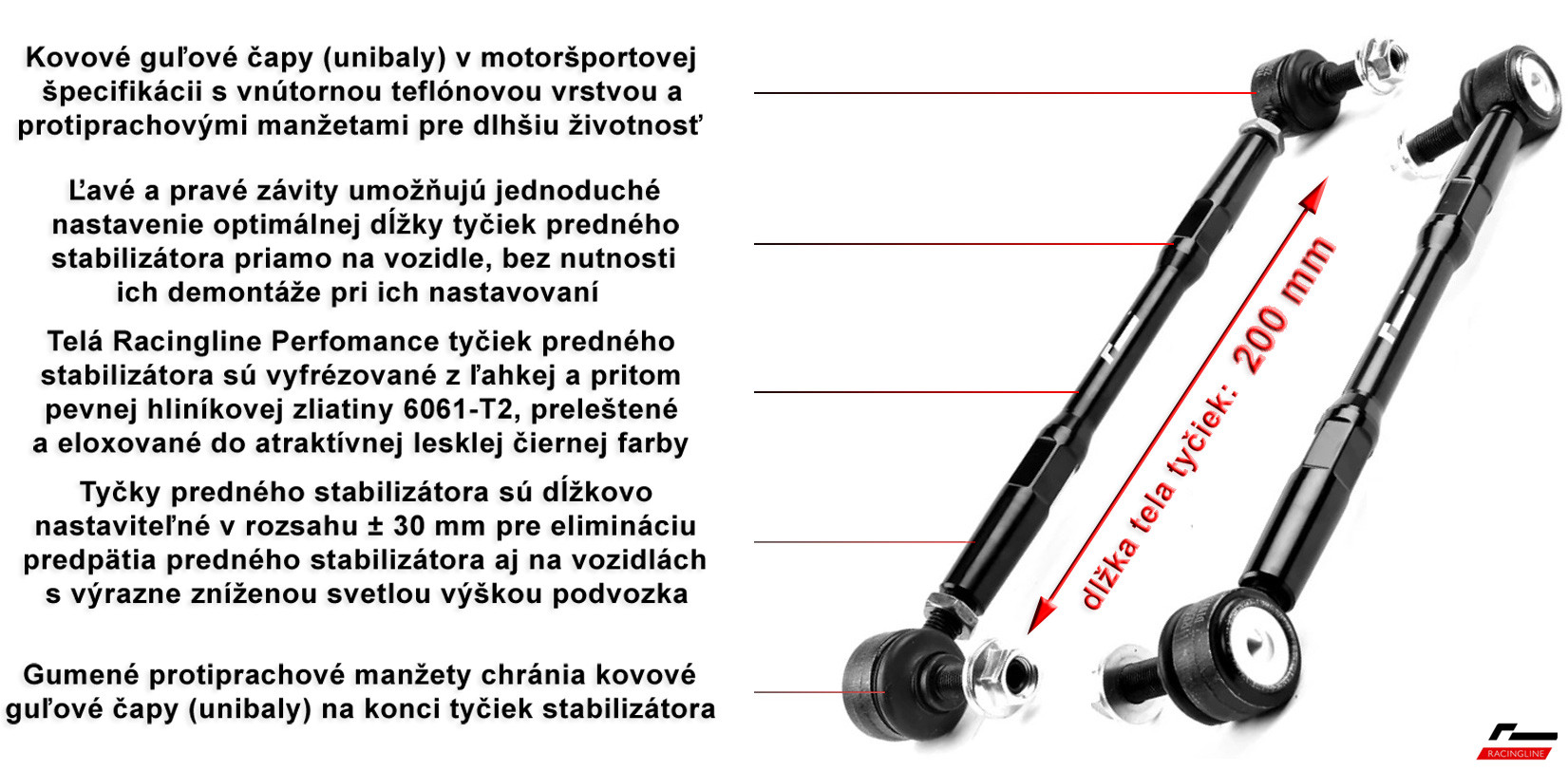 Racingline Performance dĺžkovo nastaviteľné tyčky predného stabilizátora sú nevyhnutným upgrade pre každé znížené vozidlo. Znížením sériovej svetlej výšky vozidla dochádza pri ponechaní sériových tyčiek predného stabilizátora s pevnou, nenastaviteľnou dĺžkou k zmene geometrie uloženia predného stabilizátora, čo má za následok, že je uložený v ostrom uhle, mimo rámec svojho rozsahu správneho fungovania, čo sa výrazne negatívne prejaví na jazdných vlastnostiach vozidla. Riešením sú tyčky predného stabilizátora s nastaviteľnou dĺžkou na doladenie geometrie uloženia predného stabilizátora a odstránenie jeho predpätia a nesprávnej funkcie na znížených vozidlách.