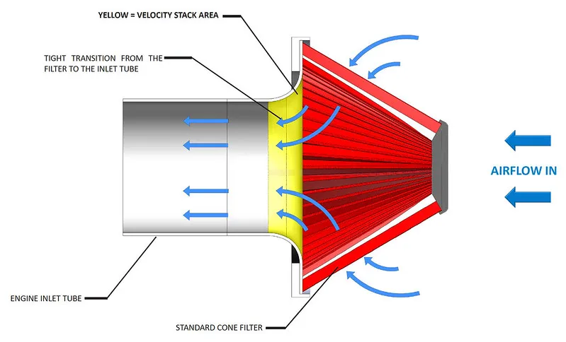 Väčšina športových sacích systémov používa kužeľový filter spojený so vstupným sacím potrubím a s nejakým typom tepelného tienenia. V tejto konfigurácii musí prúdenie vzduchu prekonať dráhu od väčšieho priemeru v spodnej časti vzduchového filtra (v mieste kde sa napája na sacie potrubie) až po menší priemer sacieho potrubia na relatívne krátkej vzdialenosti. V tejto prechodovej časti sa zvyčajne buď nakumuluje vzduch, ktorý pomáha plynulosti prechodu, väčšinou ho je však málo na to, aby zabezpečil plynulý prechod z filtra do sacieho potrubia, alebo sa tu nachádza prechodová časť potrubia (tryska), ktorá tento prechod zjemní. Ostrý prechod medzi priemerom vzduchového filtra a sacieho potrubia je škodlivý pre prietok. Výsledkom je strata odozvy plynového pedálu a zvýšenie výkonu, ktoré je oproti sériovému saniu zvyčajne len veľmi malé. Obrázok nižšie znázorňuje typické športové sacie systémy s použitím kužeľového filtra pripevneného k saciemu potrubiu. Prechodová časť sania (tryska), ktorá pomáha zjemniť rozdiel v priemeroch filtra a potrubia je zvýraznená žltou farbou.