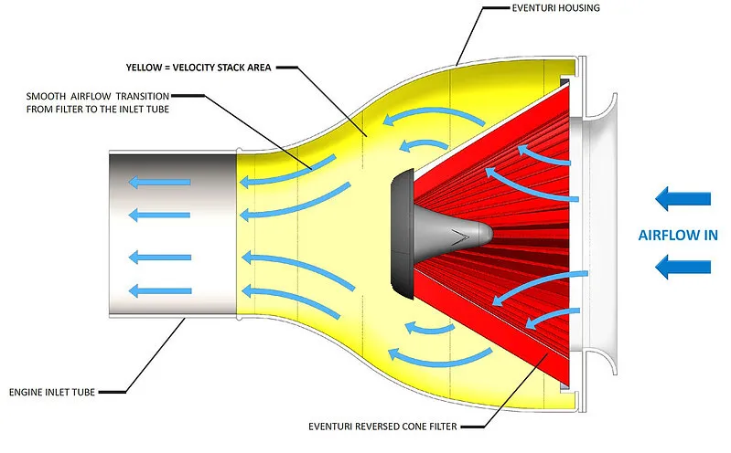 Eventuri je nový typ konštrukcie sania, na ktorý bol udelený patent. Používa síce tak isto kužeľový filter, ten je však obrátený a oddelený od sacieho potrubia. Odstránením priameho spojenia medzi filtrom a sacím potrubím zabezpečilo, že vzduchový filter už nediktuje tvar prúdenia vzduchu. Toto teraz robí karbónový obal filtra, ktorý je navrhnutý tak, aby plynulo viedol vzduch do sacieho potrubia bez náhlej zmeny geometrie. To znamená, že udržiava laminárne podmienky v celom sacom potrubí čo je oveľa efektívnejšie. Okrem toho, lievikovitý tvar obalu vyvoláva tzv. Venturiho efekt, kde plynulé zmenšenie prierezu pozdĺž celej dĺžky obalu spôsobuje zvýšenie rýchlosti prúdenia vzduchu. V podstate celý obal filtra funguje ako tryska, ktorá urýchľuje prúdenie. Na ceste sa to premieta nie len do vyššieho výkonu motora s plynulejšou dodávkou ale aj do ostrejšej odozvy škrtiacej klapky, pretože prúdenie vzduchu nie je brzdené náhlymi zmenami geometrie a preto je pravdepodobnejšie, že zostane laminárne. Obrázok nižšie zobrazuje sací systém Eventuri s použitím ich patentovaného filtra vo vnútri Eventuri obalu. Obal vzduchového filtra (tryska), ktorý pomáha zrýchliť prúdenie vzduchu je zvýraznená žltou farbou.