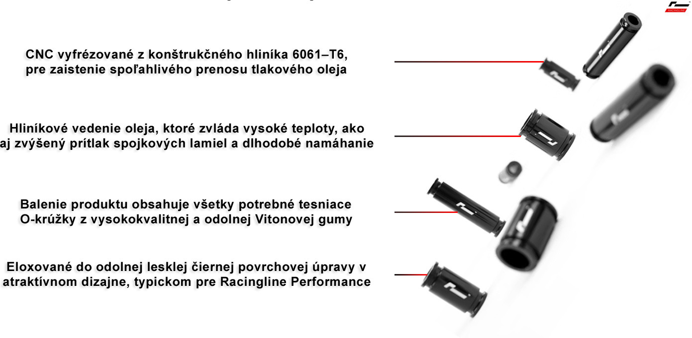 Balenie produktu obsahuje všetko, čo budete potrebovať pri výmene pôvodného továrenského plastového vnútorného rozvodu oleja za oveľa robustnejšie, pevnejšie a spoľahlivejšie hliníkové.