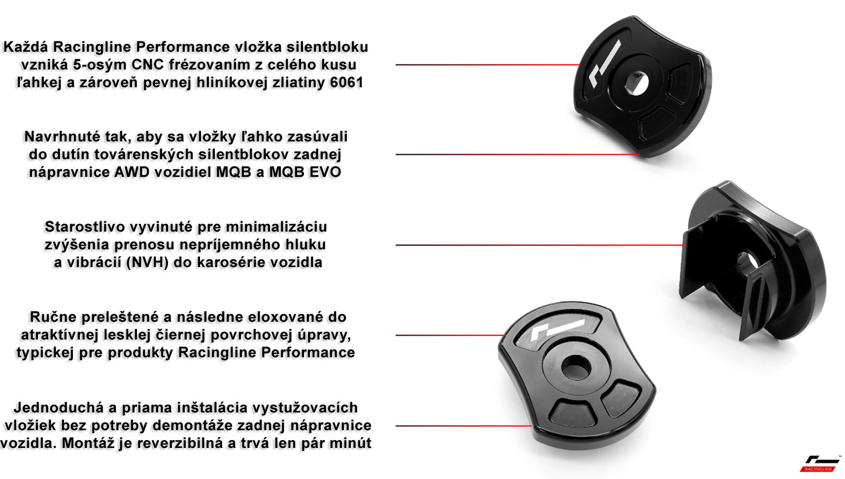Nemusíte mať obavy, že by dodatočné vystuženie uchytenia zadnej nápravnice spôsobilo zhoršenie kvality jazdy pri bežnej každodennej jazde. Vývojoví inžinieri Racingline Performance v rámci produktového vývoja otestovali a precízne odmerali viacero vývojových verzíí hliníkových vystužovacích vložiek a dospeli tak k finálnemu dizajnu, ktorý neobetuje jazdnú kvalitu, pričom neprenáša do kabíny vozidla takmer žiadny dodatočný hluk a vibrácie (NVH). Táto sada tak predstavuje výborný upgrade, ktorý vylepší jazdné vlastnosti Vášho vozidla pri entuziastickej športovej jazde v zákrutách, pričom Vaše vozidlo zostane stále rovnako použiteľné aj na bežnú každodennú jazdu.
