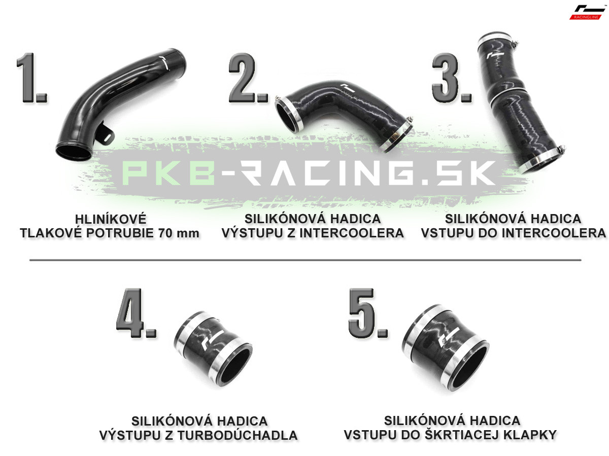 Sada Racingline Performance pozostáva z nasledujúcich 5 častí, ktoré kompletne nahrádzajú nespoľahlivé sériové plastové tlakové potrubie a gumené tlakové hadice: