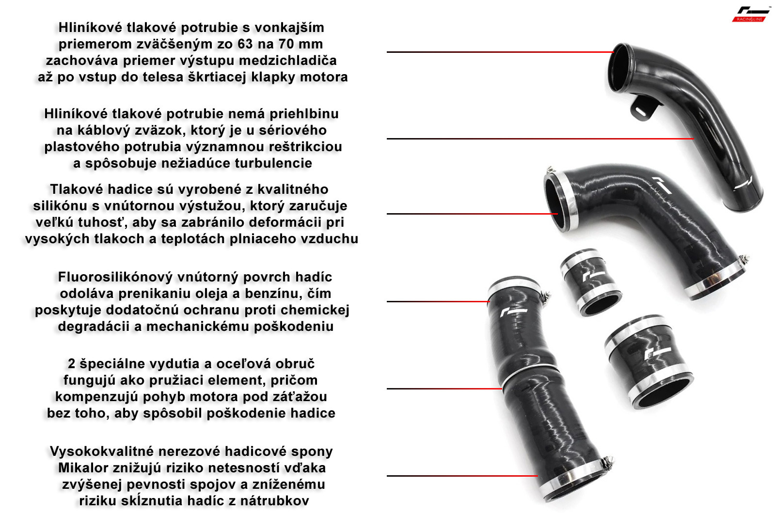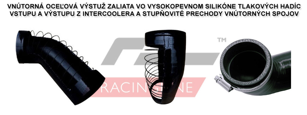 Racingline Performance silikónová tlaková hadica vstupu do medzichladiča stlačeného vzduchu (intercoolera) má v strednej časti dve špeciálne prstencové vydutia, uprostred stiahnuté nerezovou obručou, ktoré fungujú ako pružiaci element, vďaka čomu je umožnený vzájomný pohyb pružne uloženého motora voči pevne namontovanému intercooleru bez rizika poškodenia, zbortenia, resp. roztrhnutia silikónovej tlakovej hadice.