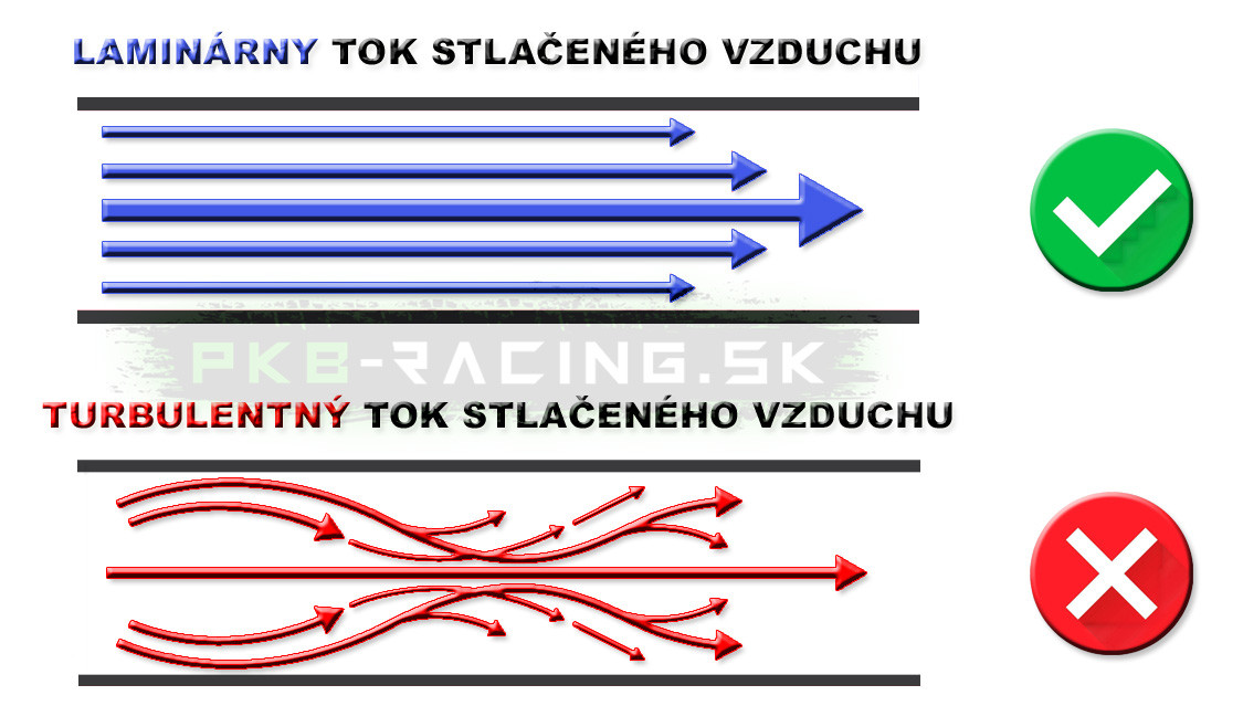 Sériový výstup z kompresorovej časti turbodúchadla má reštriktívny vnútorný priemer iba 38 mm, zatiaľ čo kužeľový dizajn Racingline Performance Turbo Muffler Delete sa postupne zväčšuje až na vnútorný priemer 53 mm, kde následne prostredníctvom stupňovitého dizajnu silikónovej hadice s rovnakým 53 mm vnútorným priemerom vytvára dokonale hladký prechod bez nežiadúcich skokov, hrán a turbulencií pri prúdení stlačeného vzduchu.