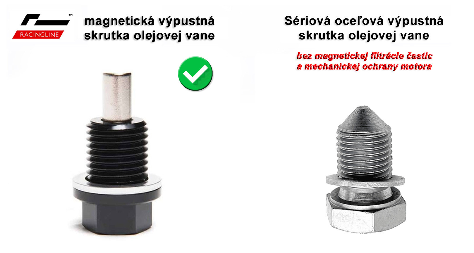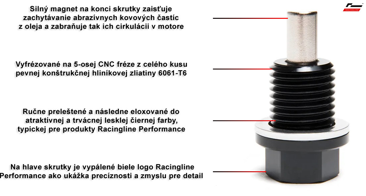 Racingline Performance výpustná skrutka motorového oleja má na svojom konci silný magnet s veľkou plochou, na ktorom sa kovové abrazívne mikročastice uvoľnené počas prevádzky motora zachytávajú a nedostávajú sa tak obehovým mazacím systémom naspäť do motora, čím sa zásadne zvyšuje jeho ochrana pred mechanickým poškodením, ako aj pred predčasným opotrebovaním.