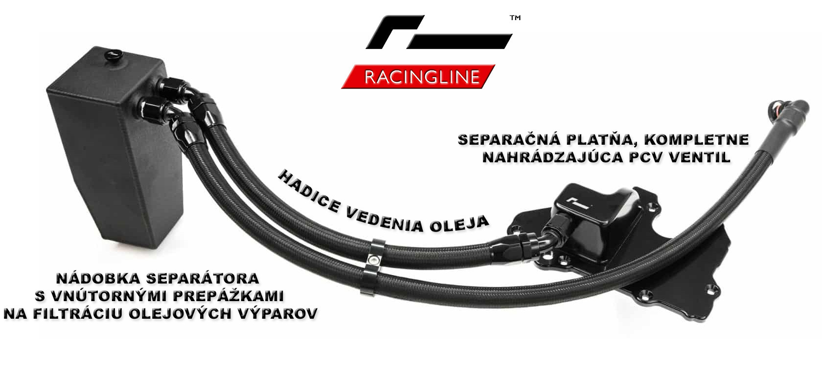Pokiaľ chcete so svojím vozidlom jazdiť a úživať si ho naplno aj na závodnom okruhu, oblúbenej okreske, resp. horskom priesmyku, jednoznačne potrebujete systém manažmentu oleja Racingline Performance Oil catch tank. Bez neho riskujete tvorbu olejových bazénov v prednej časti motora a následným nedostatočným mazaním hlavy valcov a mechanických komponentov motora. Sériový PCV ventil odvetrania olejových výparov sa môže zahltiť veľkým množstvom oleja, ktorý ďalej prepustí do sania (cez hadicu odvetrania do vstupného kolena turbodúchadla), odkiaľ sa olej dostane až do spaľovacích priestorov motora. Sprievodným javom je masívny kúdol bieleho dymu z výfuku počas prudkého brzdenia. Rozhodne nič príjemné a navyše vplyvom nedostatočného mazania a zároven spaľovania oleja hrozí aj fatálna mechanická havária motora.