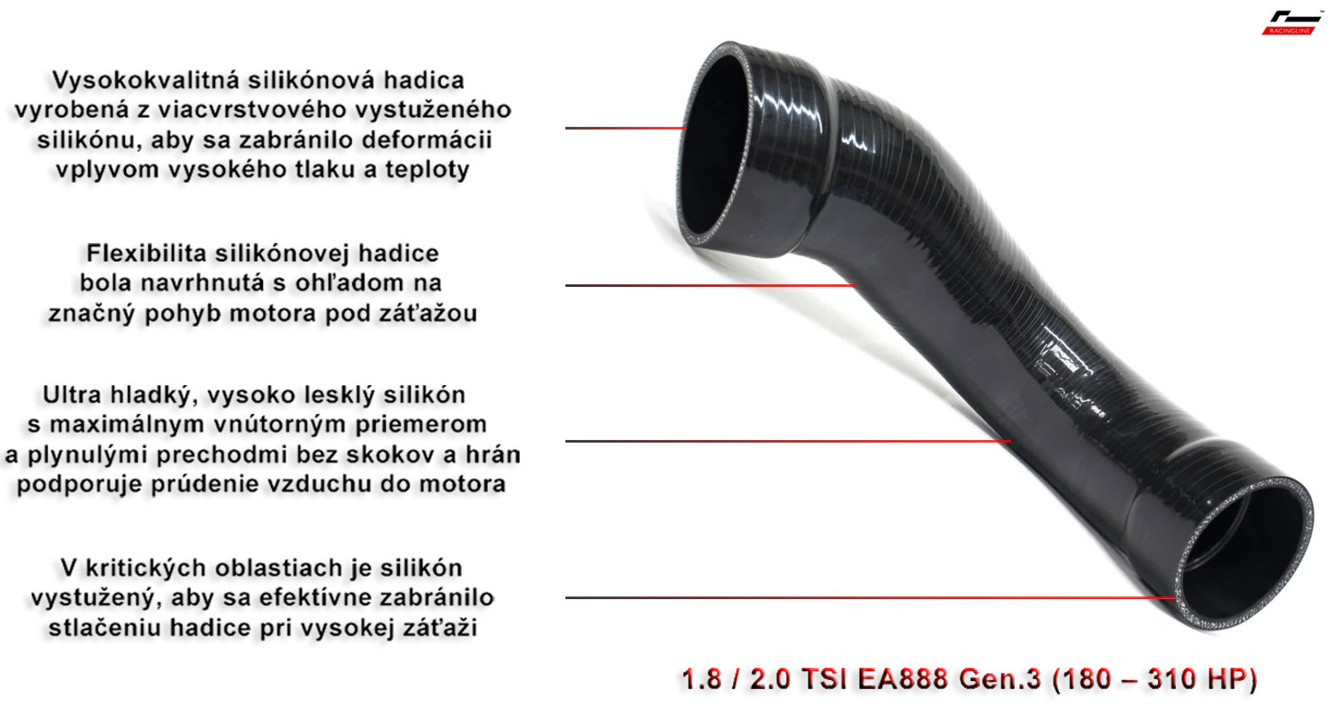 Táto silikónová sacia hadica NIE JE určená pre motory 2.0 TSI/TFSI EA888 Gen3B (140 kW – 190 HP) s MAF senzorom (váhou vzduchu) v sacom potrubí. Pre tieto motory je určená iná Racingline Performance silikónová sacia hadica.