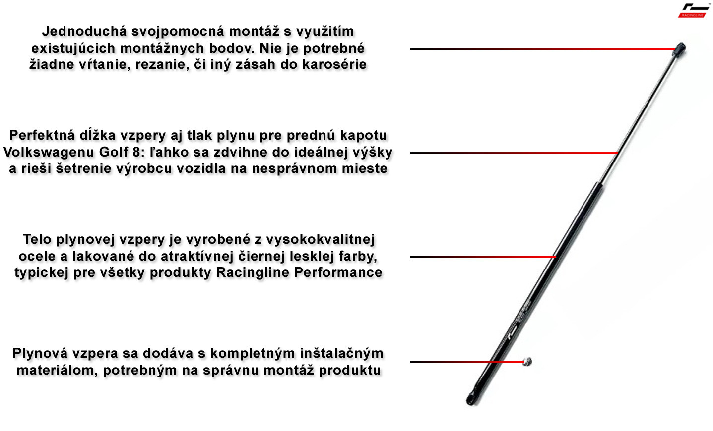 Racingline Performance plynová vzpera prednej kapoty je priamou náhradou sériovej mechanickej vzpery prednej kapoty - nepraktickej podpernej tyčky, ktorou sú nanešťastie vybavené všetky vozidlá Volkswagen Golf 8 (vrátane faceliftu), a to aj vrátane vrcholných verzií GTI, GTI Clubsport a R. Výrobcovia sa v dnešnej dobe snažia ušetriť, kde sa len dá, a tak je Volkswagen Golf 8 & 8.5 štandardne odkázaný na nevzhľadnú mechanickú vzperu prednej kapoty, čo je jednoznačným krokom späť a príklad šetrenia na nesprávnom mieste, nakoľko predchádzajúca generácia Golf 7 bola štandardne vybavená plynovými vzperami prednej kapoty.