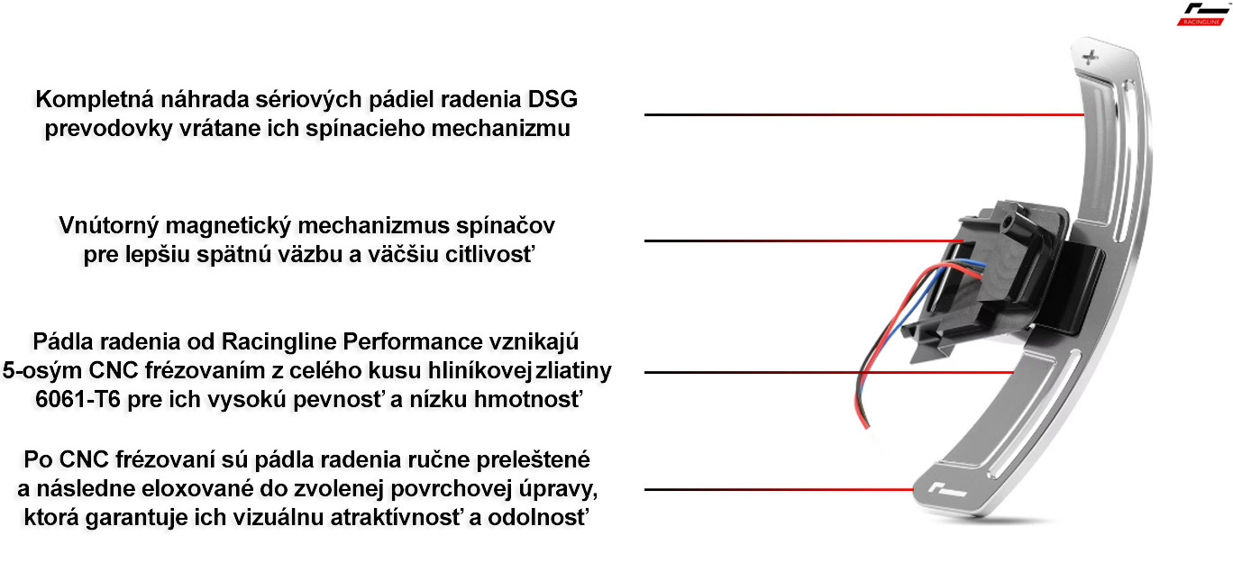 Racingline Performance magnetické pádla radenia DSG prevodovky pod volant predstavujú priamu náhradu sériových plastových pádiel radenia vrátane ich spínacích mechanizmov na volante. Ide o vysoko estetické a zároveň funkčné vylepšenie vozidla, ktoré povyšuje každú manuálnu zmenu prevodového stupňa pádlami pod volantom na zážitok, sprevádzaný jednoznačným kovovým “cvaknutím“ magnetického spínacieho mechanizmu s vylepšenou odozvou na pokyny vodiča a zvýšenou citlivosťou. Vďaka vylepšeným magnetickým spínačom tak zažijete oveľa príjemnejší a prepojenejší pocit z manuálneho ovládania prevodových stupňov Vašej automatickej prevodovky DSG a Vaša radosť z radenia dosiahne novú, doteraz nedosiahnuteľnú úroveň.