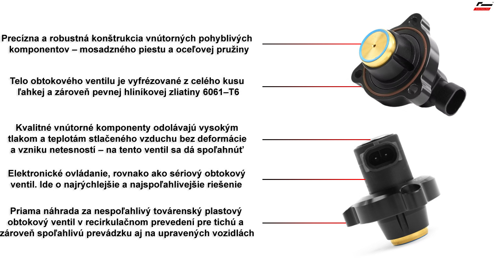 Elektronický blow-off ventil Racingline Perfomance je veľmi prínosným a v mnohých prípadoch aj nevyhnutným vylepšením pre koncernové motory 2.0 TSI EA888 Gen4 od Volkswagen Group, pričom predstavuje priamu náhradu za sériový blow-off ventil (ďalej v texte „obtokový“), ktorý býva z dôvodu svojej úspornej konštrukcie častým zdrojom problémov, predovšetkým na upravených vozidlách s vyšším plniacim tlakom a teplotou stlačeného vzduchu.