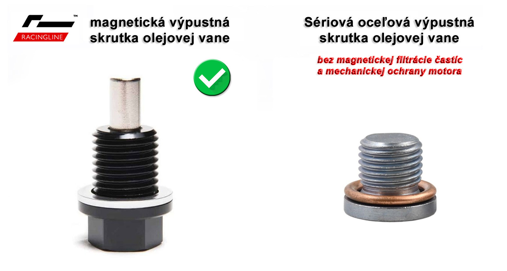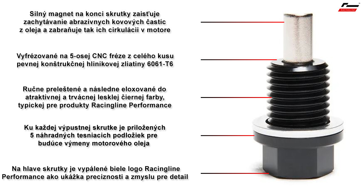 Racingline Performance výpustná skrutka motorového oleja má na svojom konci silný magnet s veľkou plochou, na ktorom sa kovové abrazívne mikročastice uvoľnené počas prevádzky motora zachytávajú a nedostávajú sa tak obehovým mazacím systémom naspäť do motora, čím sa zásadne zvyšuje jeho ochrana pred mechanickým poškodením, ako aj predčasným opotrebovaním.